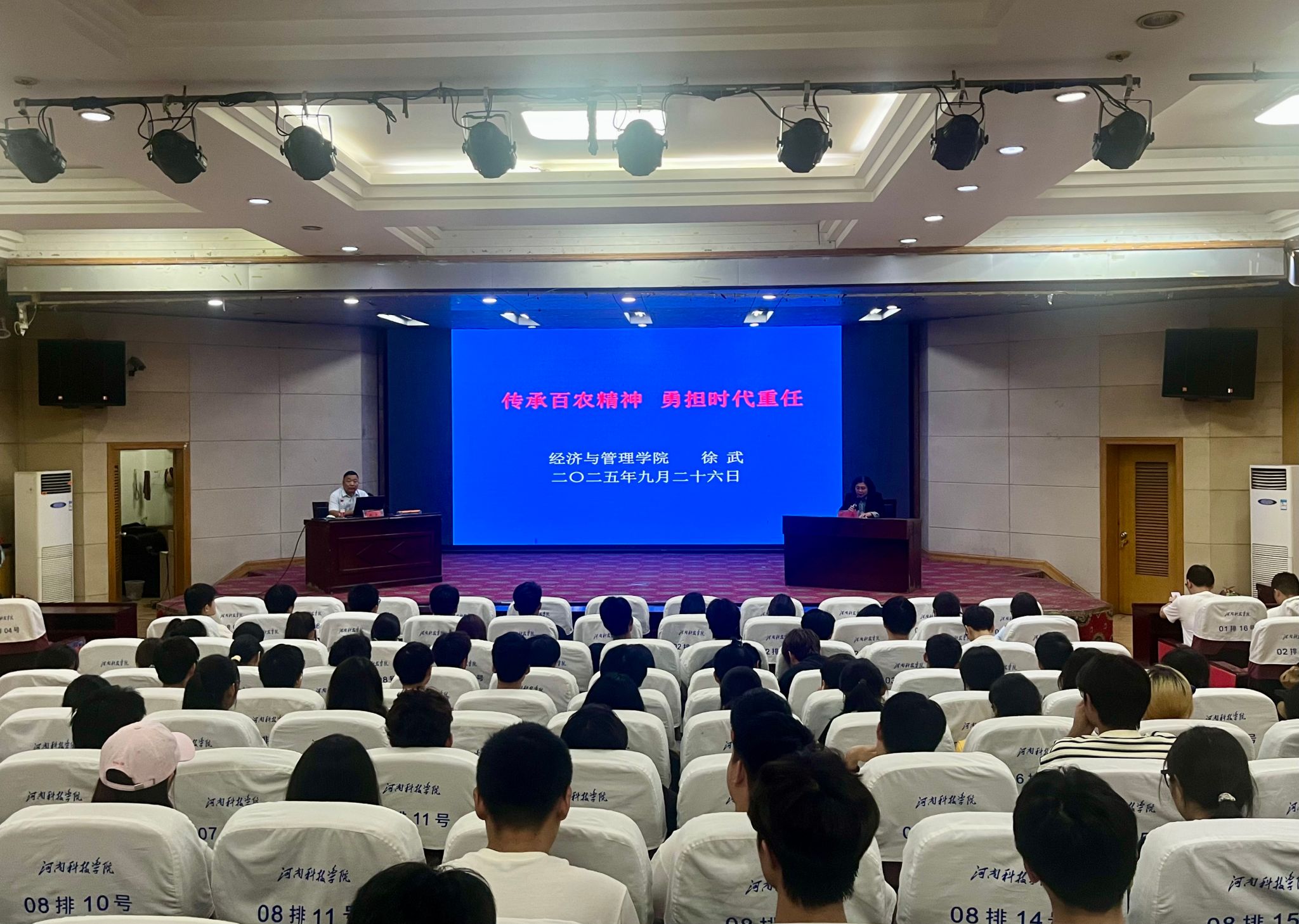 为践行和弘扬“百农精神”,激励青年学子传承红色基因,9月26日晚上,经济与管理学院徐武老师受邀担任主讲嘉宾在图教201为PG电子游戏平台(中国)官方网站 学子作题为“传承百农精神,勇担时代重任”的报告,2025级新生及入党积极分子共计300余人参会。报告会由学院党委书记周启主持。