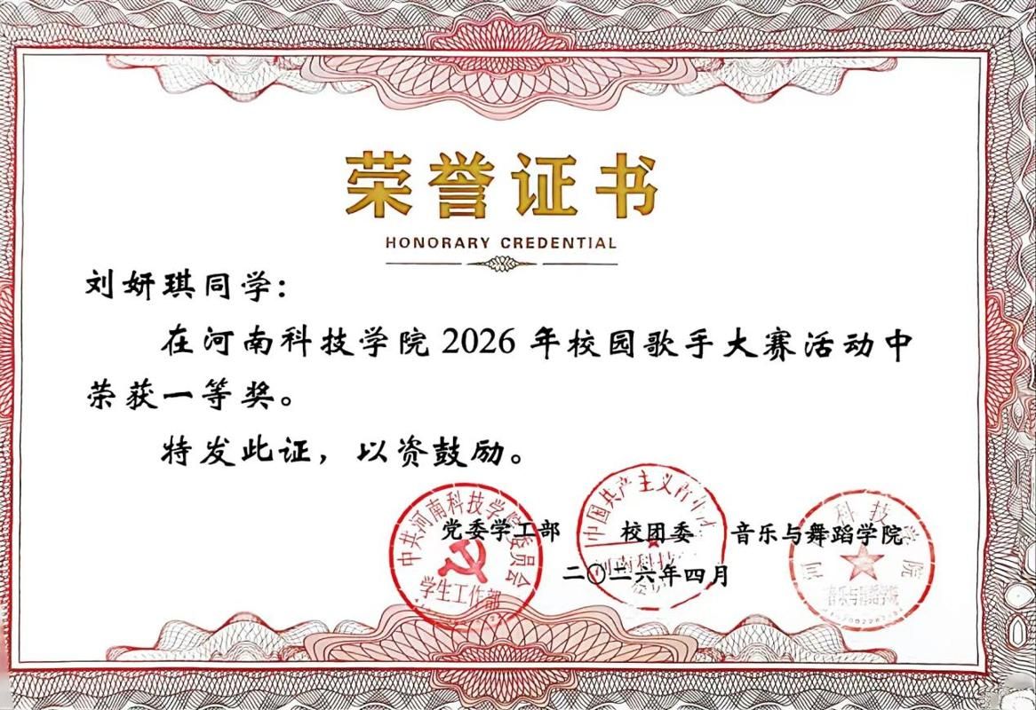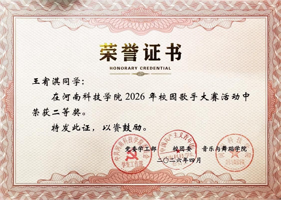 近日,由党委学工部、校团委主办,音乐与舞蹈学院承办的河南科技学院“唱响青春,声动中原”校园歌手大赛圆满落幕。PG电子游戏平台(中国)官方网站 学子在比赛中表现突出,数据251班刘妍琪荣获一等奖,计科253班王宥淇荣获二等奖。